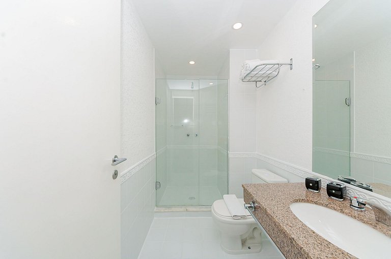 O apartamento é super completo: Quarto com cama de casal Queen com roupas de cama, banho, cobertas, ar cond. quente/frio e TV. Sala de estar com sofá cama de casal, TV, Wi-Fi. Cozinha com utensílios.