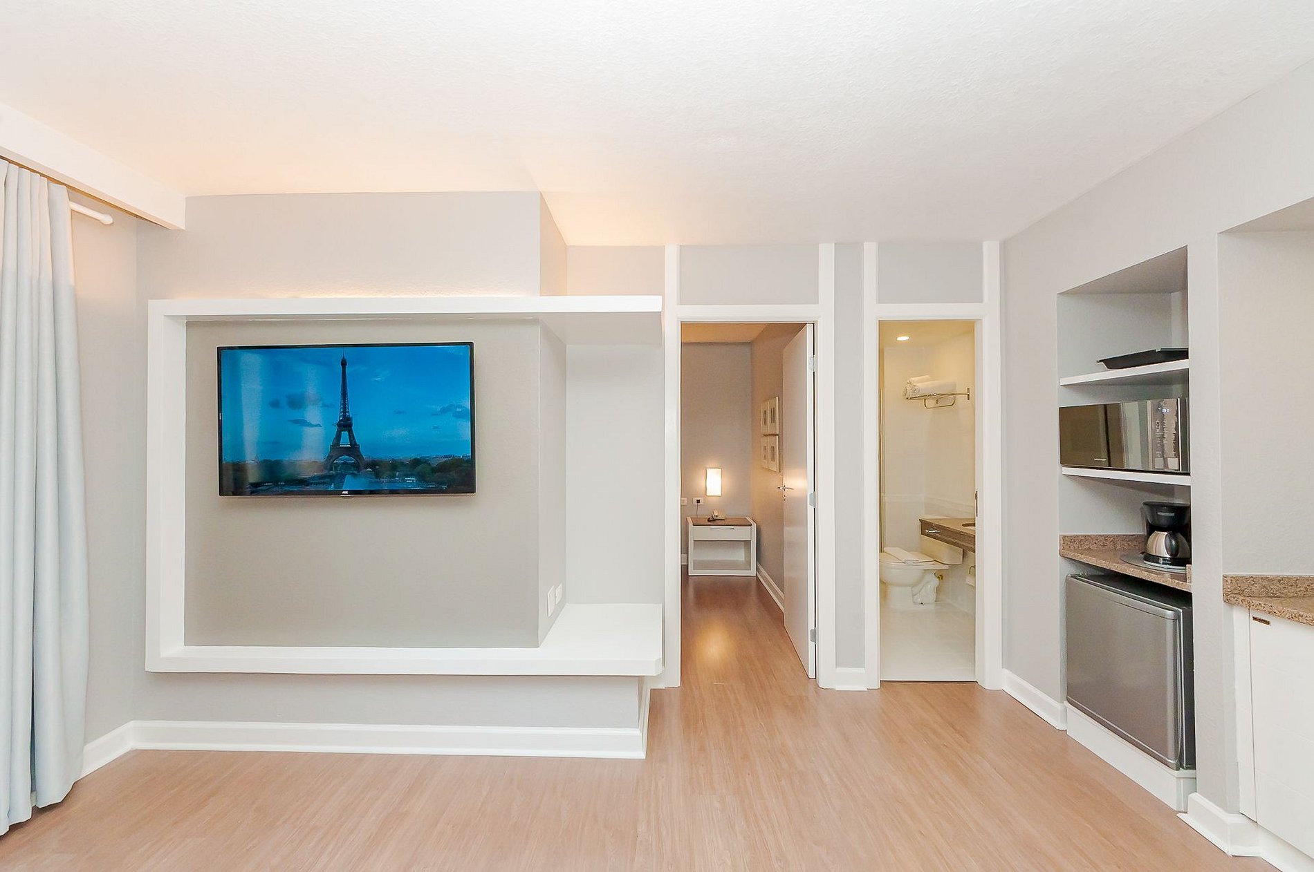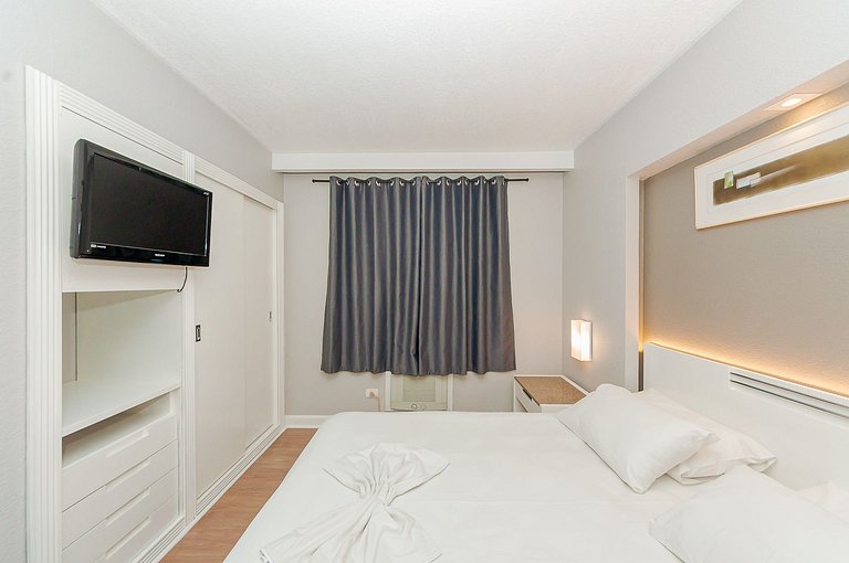O apartamento é super completo: Quarto com cama de casal Queen com roupas de cama, banho, cobertas, ar cond. quente/frio e TV. Sala de estar com sofá cama de casal, TV, Wi-Fi. Cozinha com utensílios.