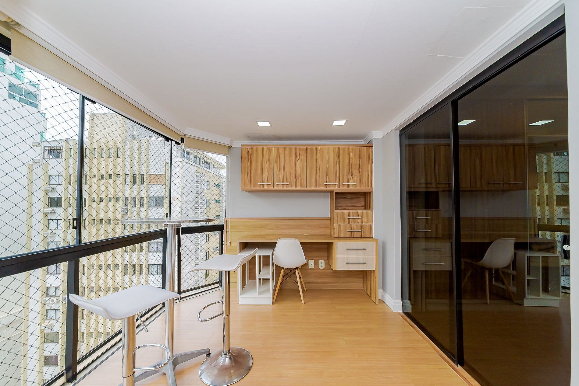 Sacada com linda vista anexa a sala de jantar e estar, com uma TV 75'' e Wi-Fi