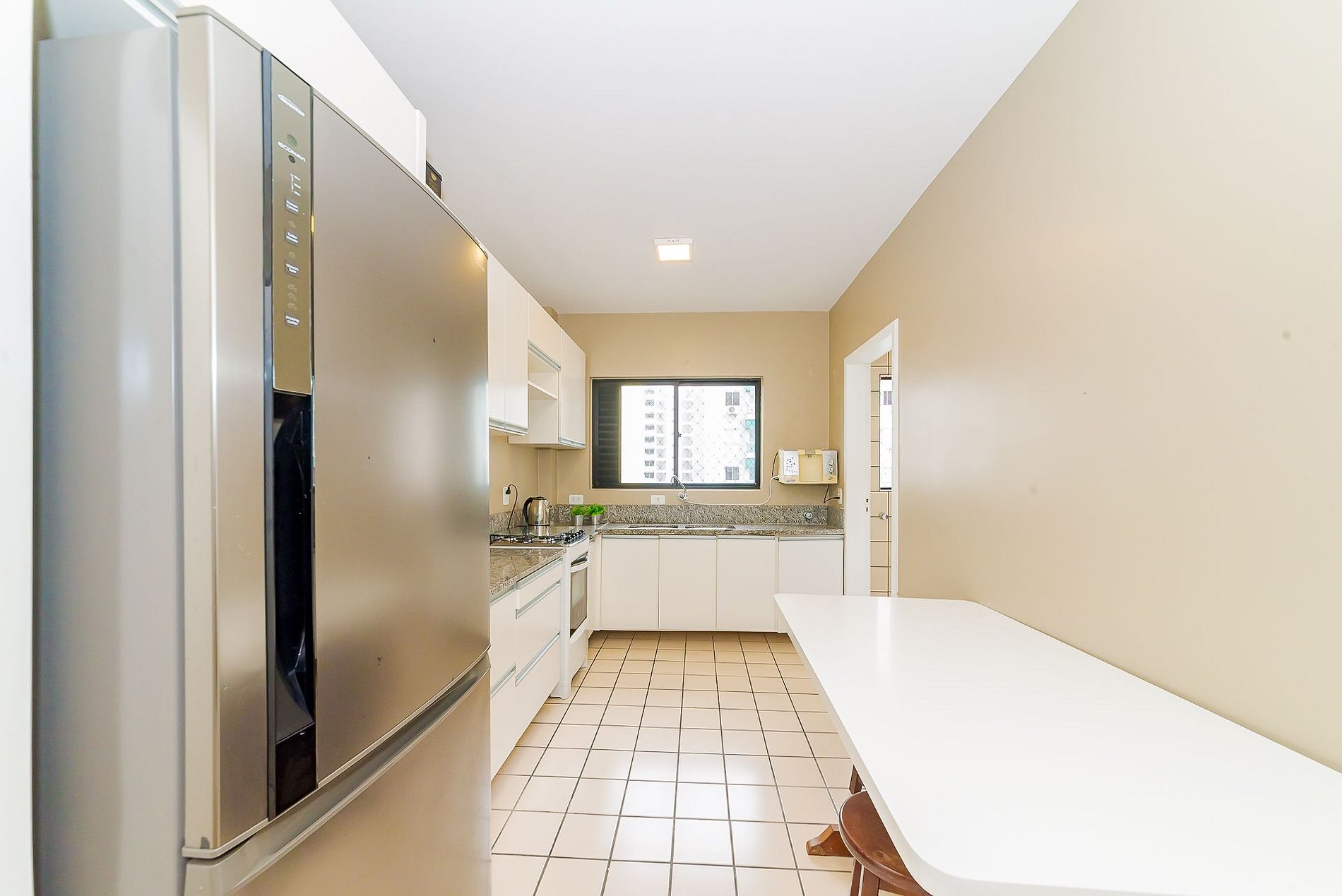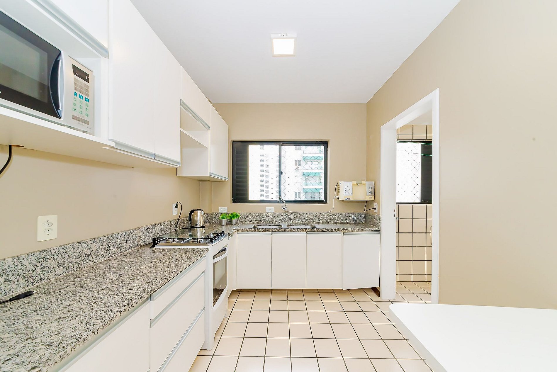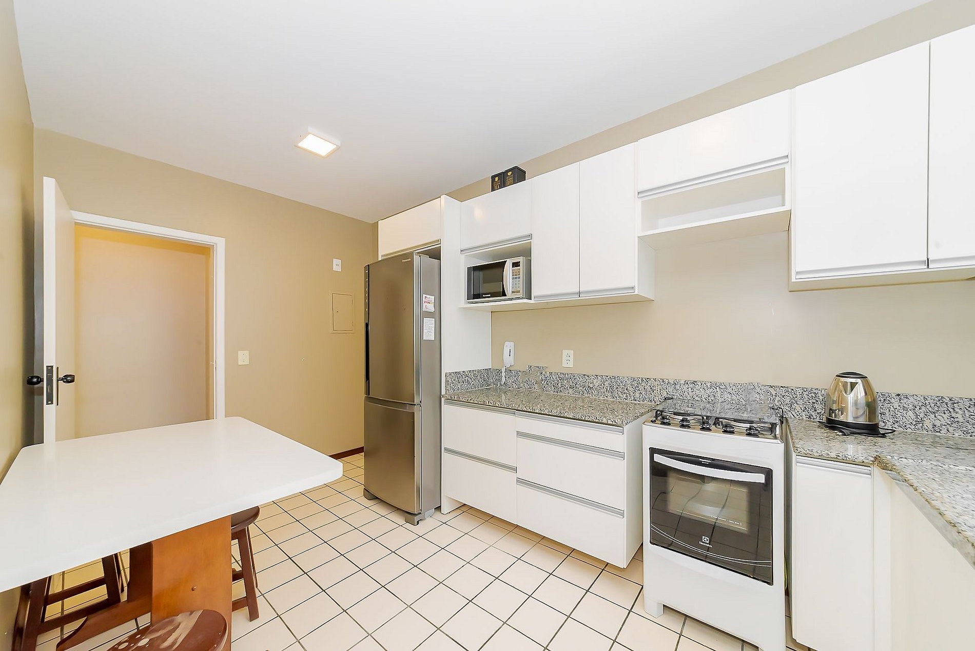 - Cozinha completa: geladeira com freezer, fogão, forno, micro-ondas, churrasqueira elétrica, panelas e todos os utensílios;