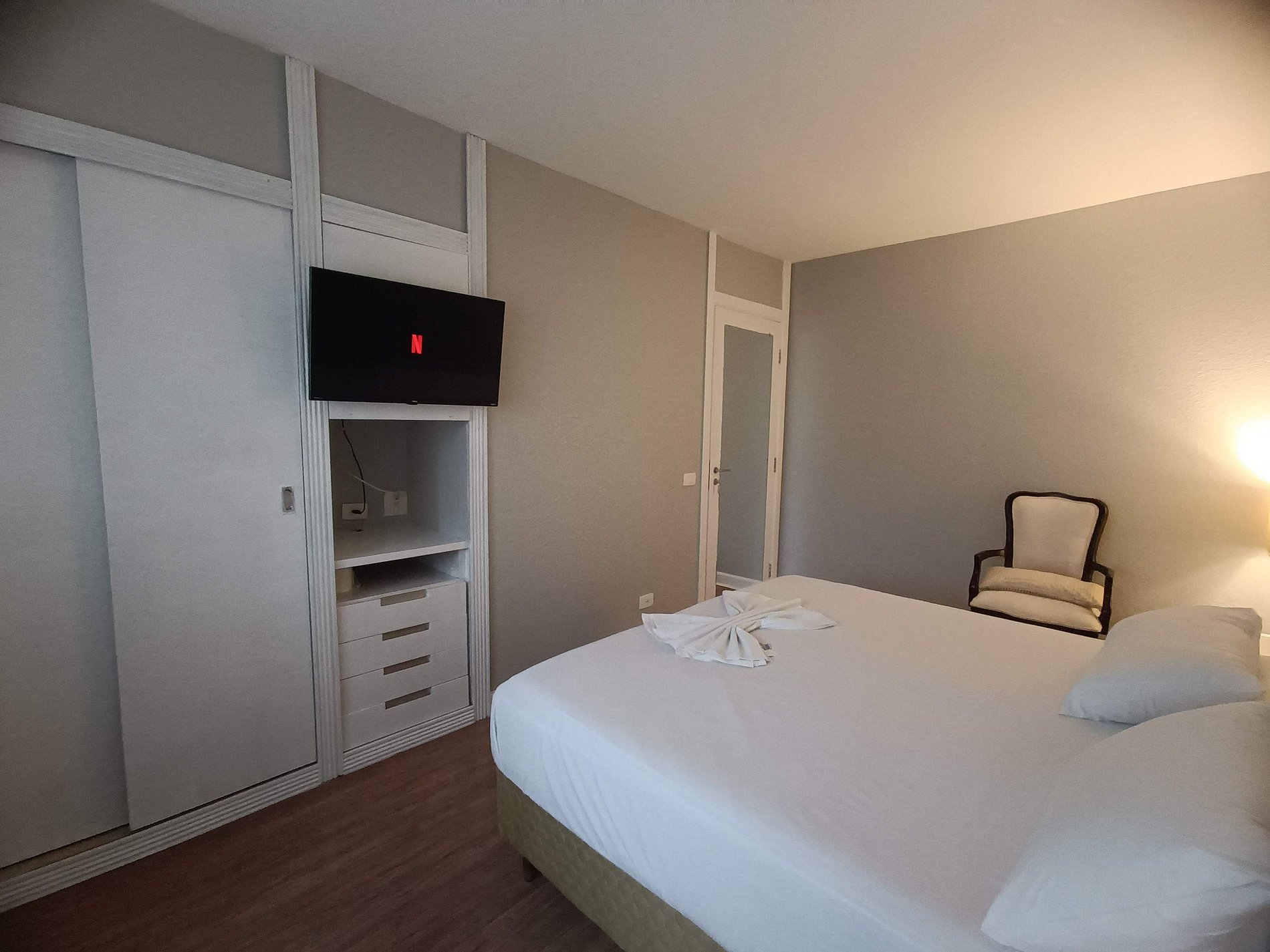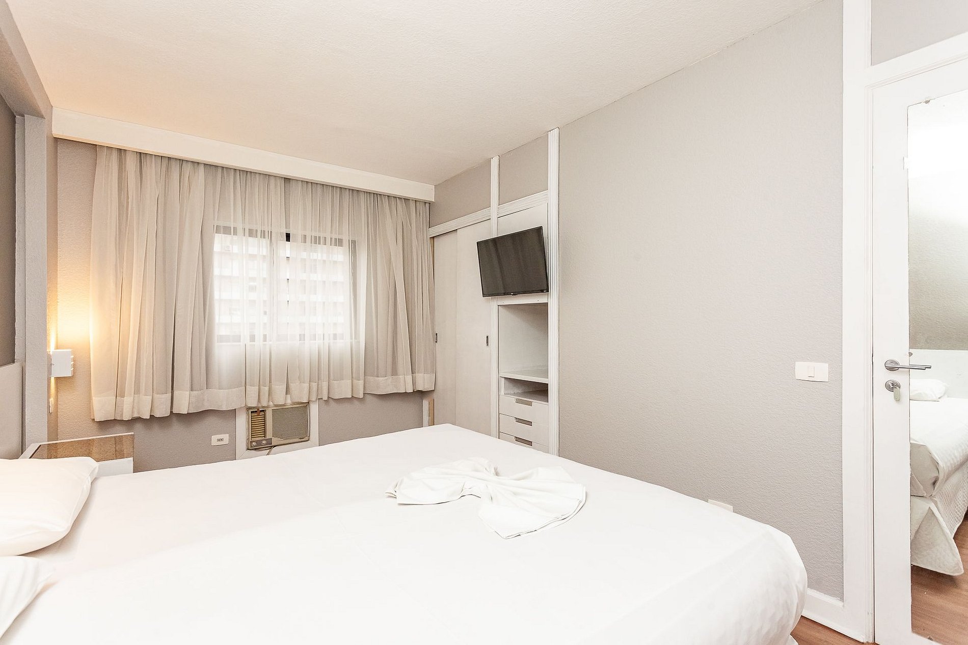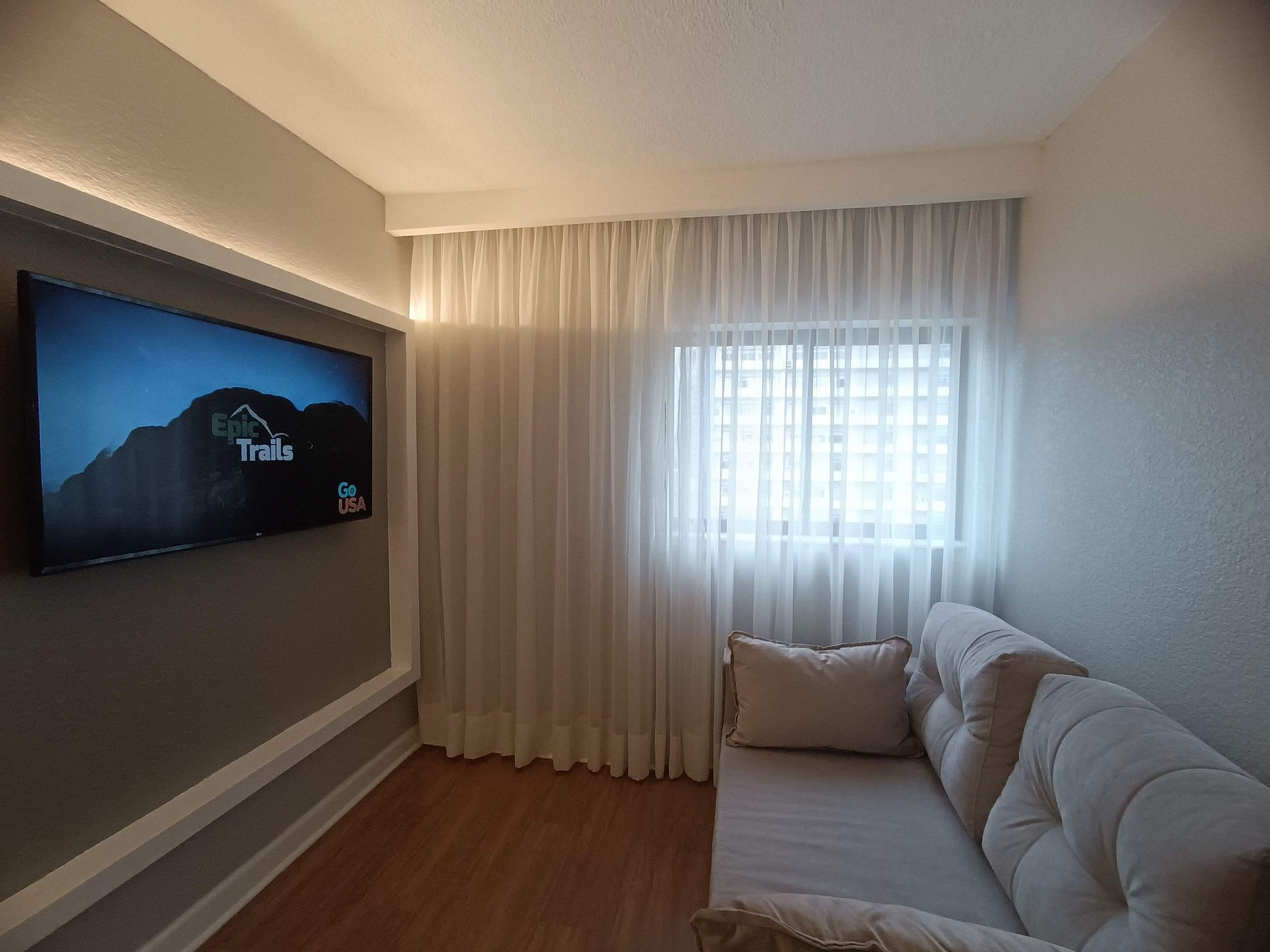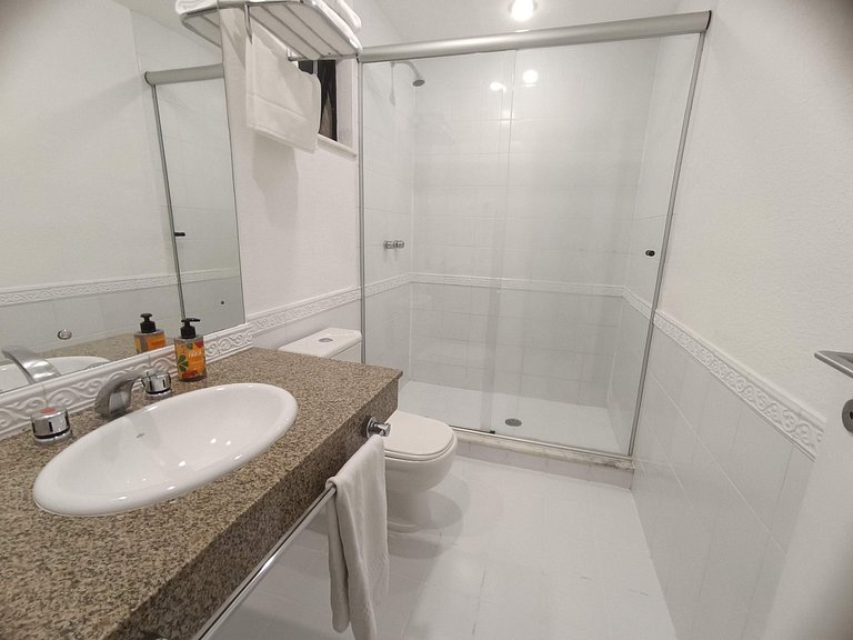 O apartamento é super completo: Quarto com cama de casal Queen com roupas de cama, banho, cobertas, ar cond. quente/frio e TV. Sala de estar com sofá cama de casal, TV, Wi-Fi. Cozinha com utensílios.